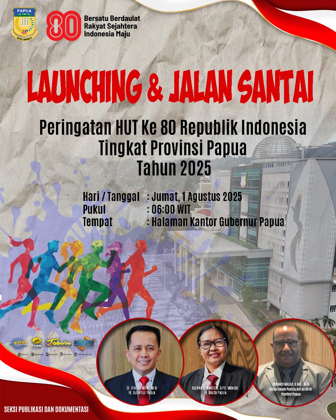 Setiap ASN di harapkan dapat mengambil bagian dalam Lounching dan Jalan Santai Memperingati HUT RI ke 80 Tingkat Provinsi Papua Tahun 2025 yang dilaksanakan pada hari Jumat, 1 Agustus 2025, Pukul 06.00 wit, bertempat di Halaman kantor Gubenur Provinsi Papua.